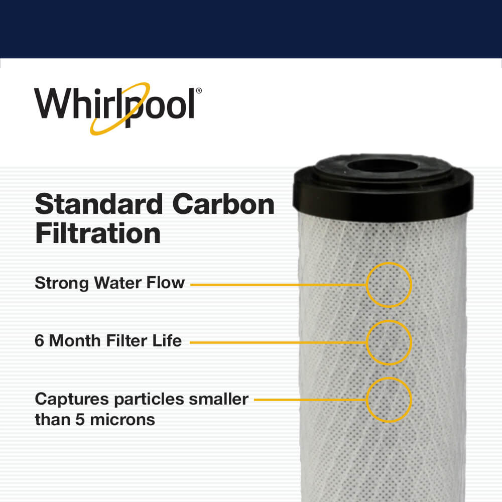 The Whirlpool Standard Capacity Carbon Whole Home Replacement Filter (WHA2BF) is best-in-class. Over time, harmful sediments like dirt, rust, and sand can build up in your plumbing and water-using appliances and cause them to fail. These whole home replacement filters offer far more protection than average by greatly reducing chlorine taste and odor and sediment (5 microns). On top of this, the Whirlpool Standard Capacity Carbon Whole Home Replacement Filter maintains a strong water flow while maintaining a 6-month replacement time. It’s designed for use in the Whirlpool PS-WHS-H whole home filtration system and — because the WHA2BF is built to be a Universal Fit — it fits all major brands of standard capacity whole home filtration systems.